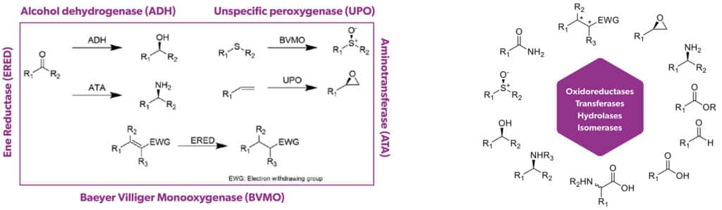Biocatalysis is commonly defined as the use of enzymes to catalyze chemical reactions. The use of biocatalysts in the pharmaceutical industry is rapidly growing thanks to their exquisite chemo- regio- and enantioselectivity in chemical transformations. This, alongside other properties such as mild reaction conditions, makes them perfect catalysts for sustainable processes. Reduced side reactions, shorter synthetic routes, and less waste result in safer technology, which is very attractive from an industrial perspective. Furthermore, enzymes are tunable catalysts through molecular engineering. They can be evolved rapidly to become active and selective to non-natural substrates, making biocatalysis a powerful additional tool in organic synthesis. These engineered enzymes can be used in challenging selective unnatural reactions within operationally simple processes which is a very appealing alternative to some conventional chemistry approaches. Over the last 10 years, the widespread availability of libraries of specific classes of enzymes in easy-to-use isolated forms has enormously stimulated the increased use of biocatalysis in the production of advanced intermediates and APIs.