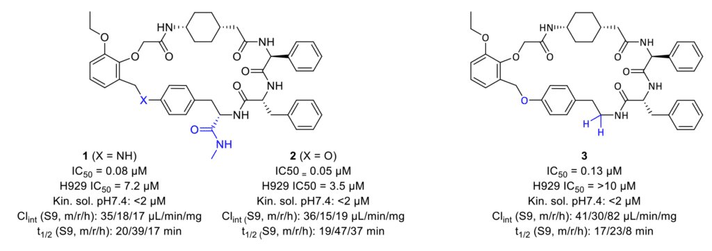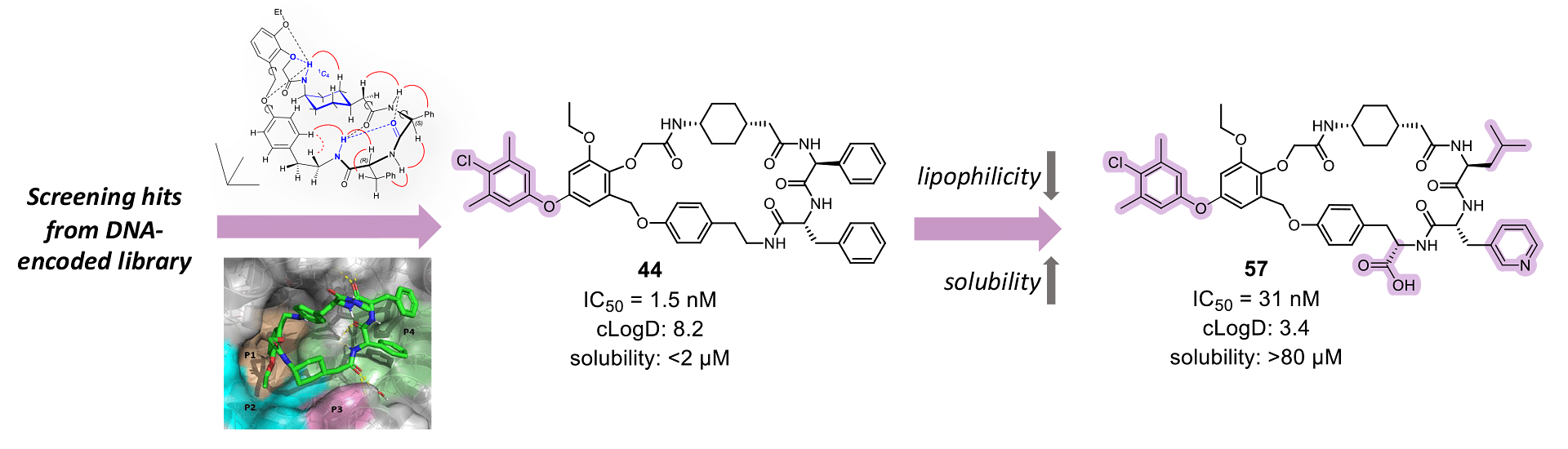 The initial library was composed of 95 billion compounds covalently attached to a unique sequence of DNA, which permitted identification. This screening led to three macrocyclic hits with decent micromolar activities but poor physicochemical properties that had to be further optimized.