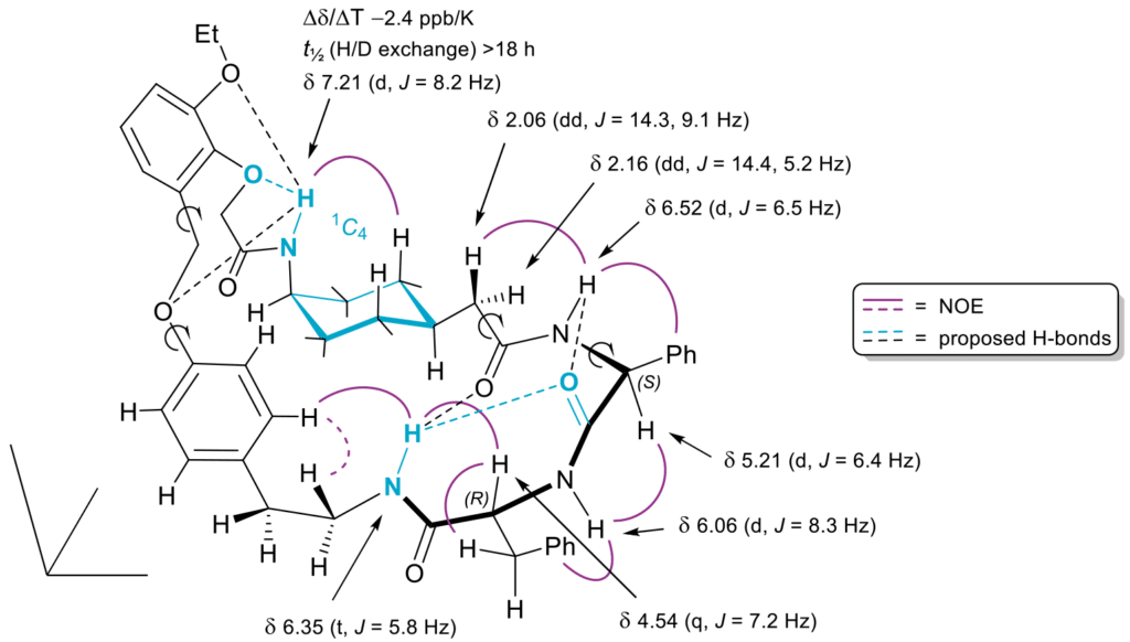 To get a better understanding of the SAR of the compounds synthesized, 2D NMR studies at variable temperatures and H/D exchange experiments in different solvents were performed. The structures of two isomeric macrocycles (active 3 and inactive 18 (compound numbers correspond to the J. Med. Chem. article)) were analyzed.