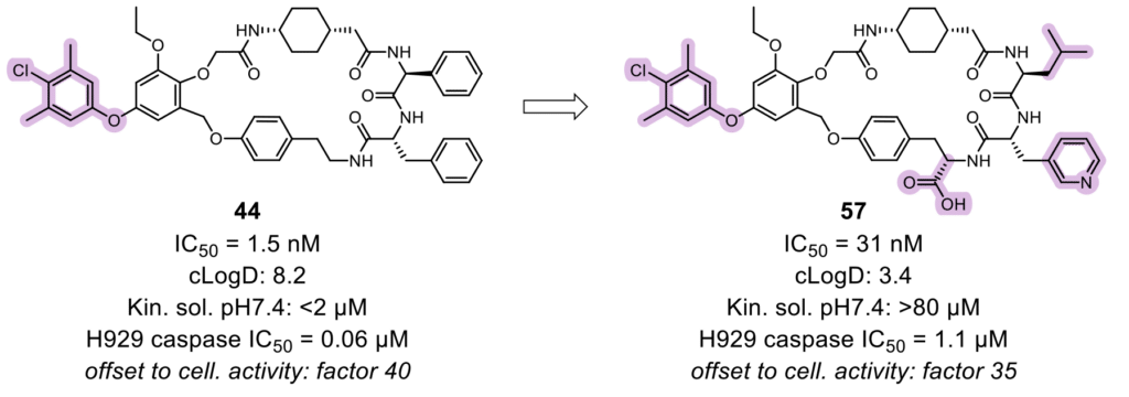 This structural knowledge-oriented lead optimization towards an increase of the affinity to the P1’ pocket. Two hundred new compounds were prepared with this aim. The introduction of biaryl alkynes improved the activity but, due to the rigid conformation, reduced the permeability. The introduction of aryl ethers improved the flexibility and permeability, thus achieving IC50 below 100 nM. Although properties such as potency, metabolic stability, and selectivity over BCl-xl were remarkable, the macrocyclic compounds showed poor solubility at physiological pH. This could be improved by increasing the polarity of the side chains. Lead candidates were finally selected based on their high activity and improved physicochemical properties of excellent aqueous solubility and moderate permeability.
