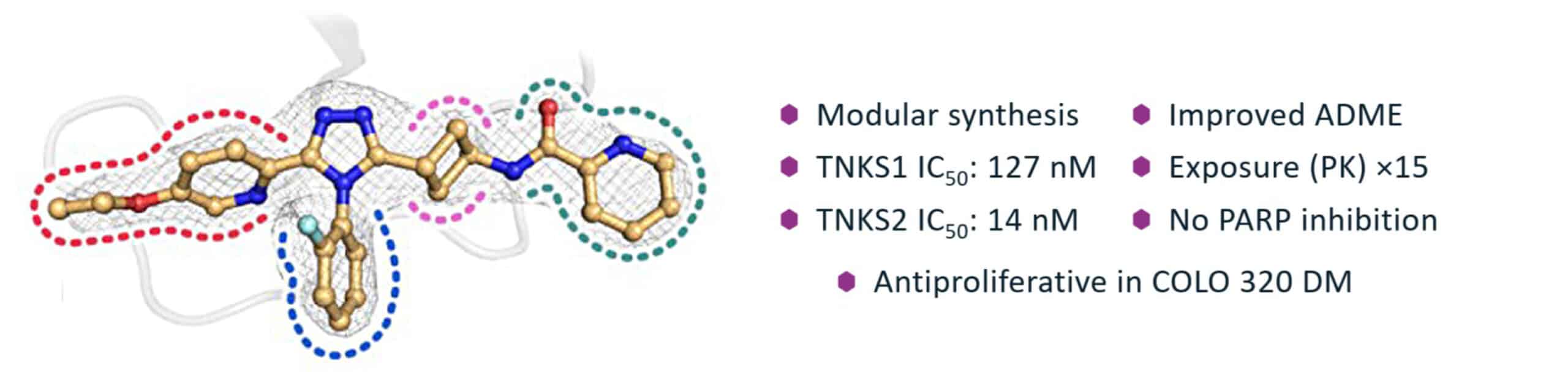 Tankyrase 1 and 2 (TNKS1/2) are pivotal enzymes in the PARP family, influencing key proteins within the WNT/β-catenin and Hippo signaling pathways. Their inhibition offers a promising avenue for oncology therapeutics, as TNKS1/2 regulates the stability and activity of proteins like AXIN1/2 and AMOT, which affect cell proliferation and tumor growth. Although TNKS1/2 inhibitors have already been shown to display anticancer efficacy in mouse models against colorectal cancer, osteosarcoma, and melanoma (as monotherapy or in combination therapies), no TNKS1/2 inhibitors have been clinically approved to date. Hence, Prof. Stefan Krauss approached us to develop novel TNKS1/2 inhibitors with an improved physicochemical and biological safety profile, as these inhibitors showed potential for effective cancer treatment and valorization.