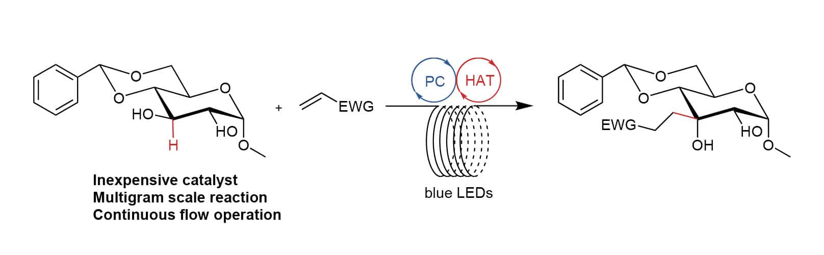 The article describes how a glucose derivative can be alkylated site specifically with a variety of substrates in a photoflow setup, which, to the best of the authors’ knowledge, has not been done before. The photoflow setup allows the synthesis of multigram quantities of the products, which is sufficient for their use as building blocks for a variety of research routes.