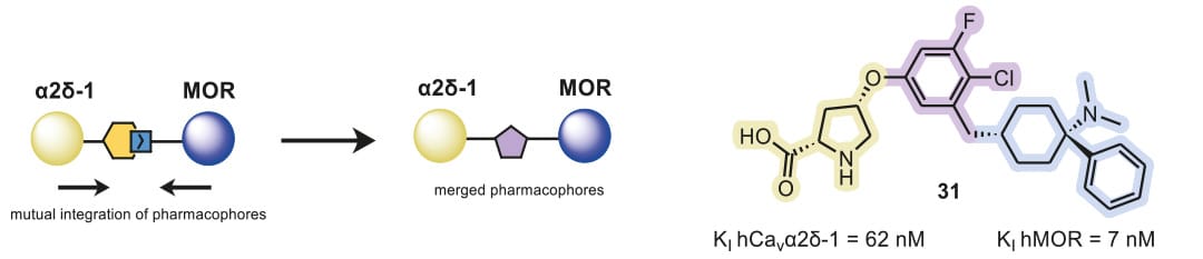 The overlapping and merging of two known pharmacophores of the Cavα2δ-1 subunit and MOR enabled the design of novel small-molecule inhibitors as dual ligands, which displayed binding elements for both targets on a central core structure (Figure 1). Following this approach, MOR-binding structural features were added to a previously published Cavα2δ-1 ligand, and via the synthesis of a small, focused, analog library, the structure–activity relationship of these hybrid binders was explored.